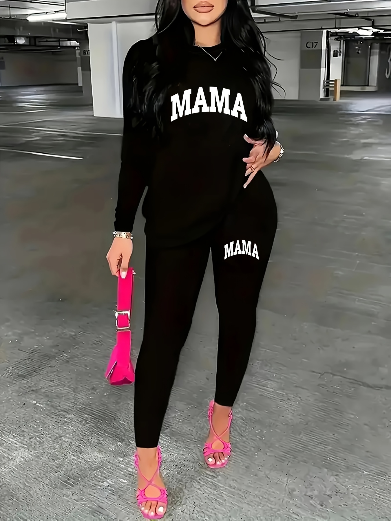 [Casual Two-Piece Set] FLS9300WM23 Women's Casual Two-Piece Set: Soft Stretch Fabric, Black Long Sleeve "MAMA" Print Top with Matching Pants - Perfect for Spring and Autumn, Bold Print, Stretchy