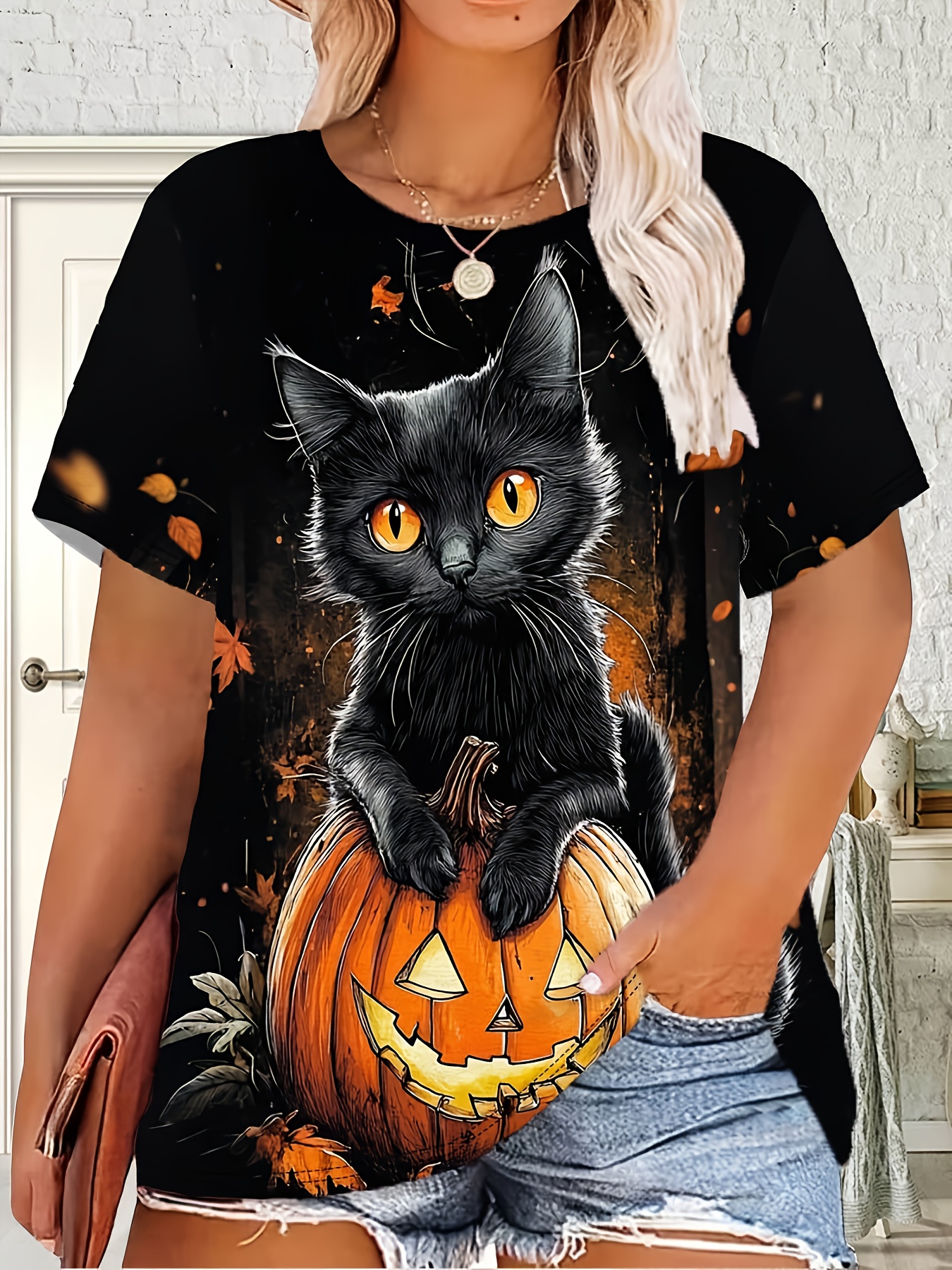 Plus Size, Large Size Women's Halloween Cat T-Shirt - 3D Print Design, Round Neck Short Sleeve Casual Top for Parties, Casual Attire & Gifting | Durable Lightweight Fabric | Stretchy Material