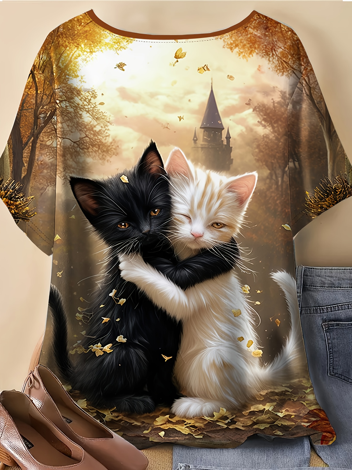 Plus Size, Women's Plus Size Oversized Cat T-Shirt - Fantasy Forest Print with Black & White Kittens, Castle & Golden Leaves - Soft Stretch Round Neck Short Sleeve Summer Top for Casual & Elegant Outfits (Machine Washable) - Cat Lover Apparel