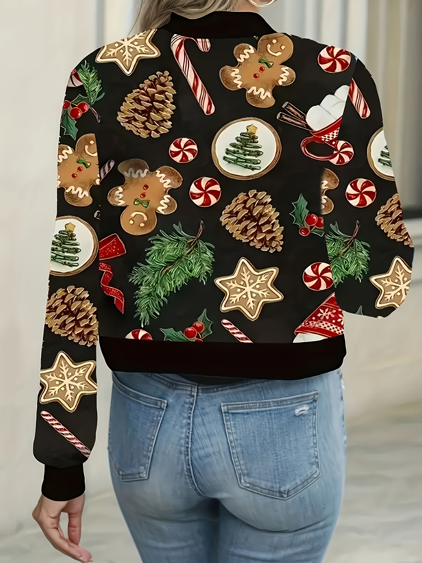 [Christmas Women's Jacket] Christmas Women's Polyester Zip-Up Jacket | Long Sleeve Round Neck Casual Coat, Festive Holiday Motifs, Relaxed Fit, Nonstretch Fabric, Durable Material, Hand Wash Only