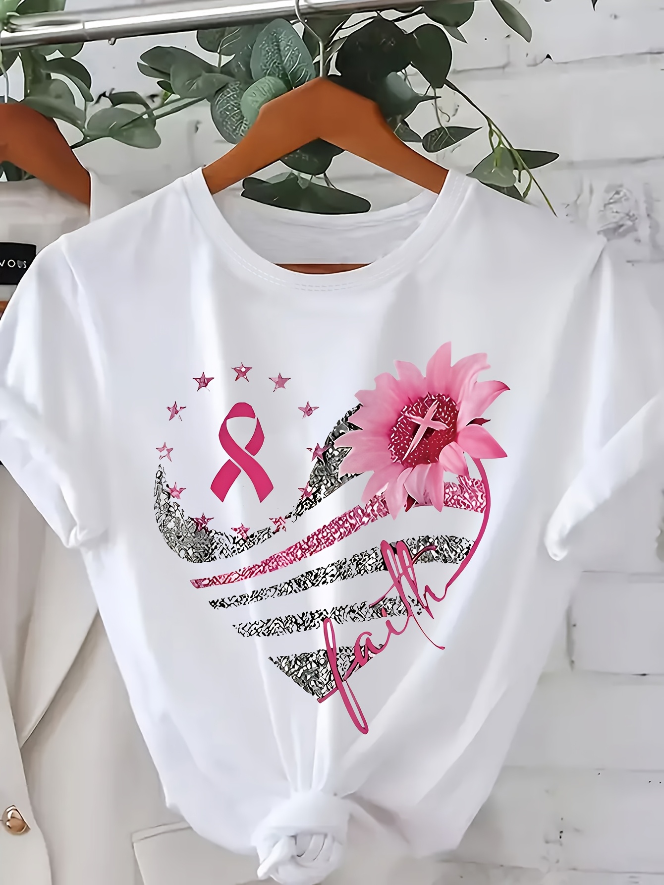 Plus Size - Women'S Plus Size Elegant Pink Breast Cancer Awareness T-Shirt - Heart & Ribbon Design, Medium Stretch Crew Neck, Short Sleeve Tee for Spring/Summer/Fall, Breast Cancer Awareness Shirts