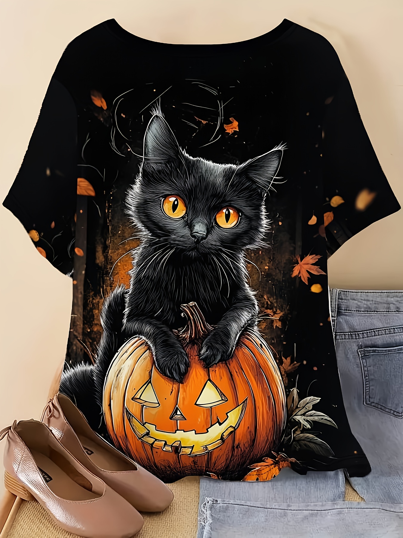 Plus Size, Large Size Women's Halloween Cat T-Shirt - 3D Print Design, Round Neck Short Sleeve Casual Top for Parties, Casual Attire & Gifting | Durable Lightweight Fabric | Stretchy Material