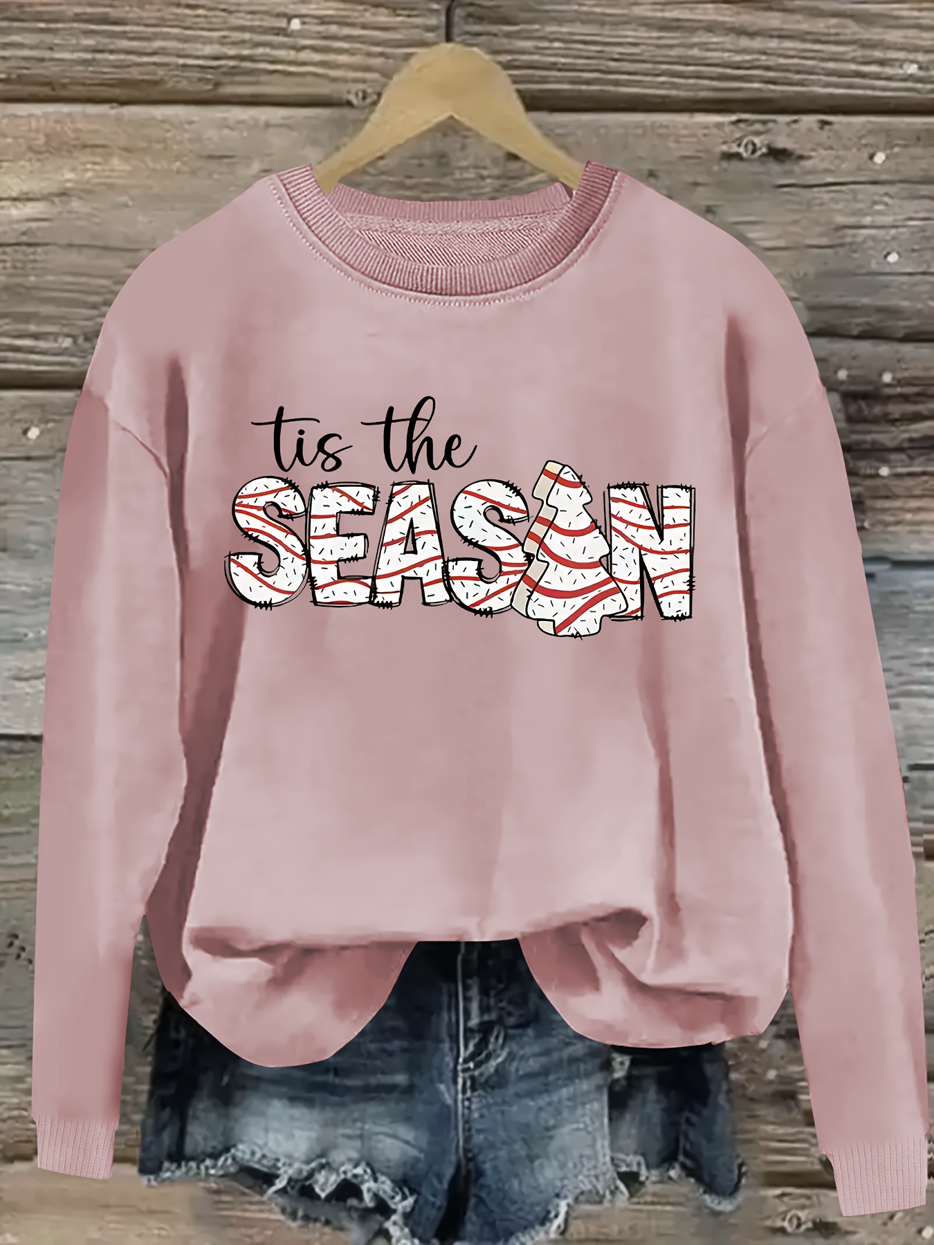 Plus Size Women's Christmas "Tis the Season" Graphic Sweatshirt - Oversized Casual Round Neck Pullover with Candy Cane Stripes, Vibrant Pink Cozy Winter Top, Machine Washable Holiday Apparel, Christmas Sweatshirt, Festive Clothing, Relaxed Fit