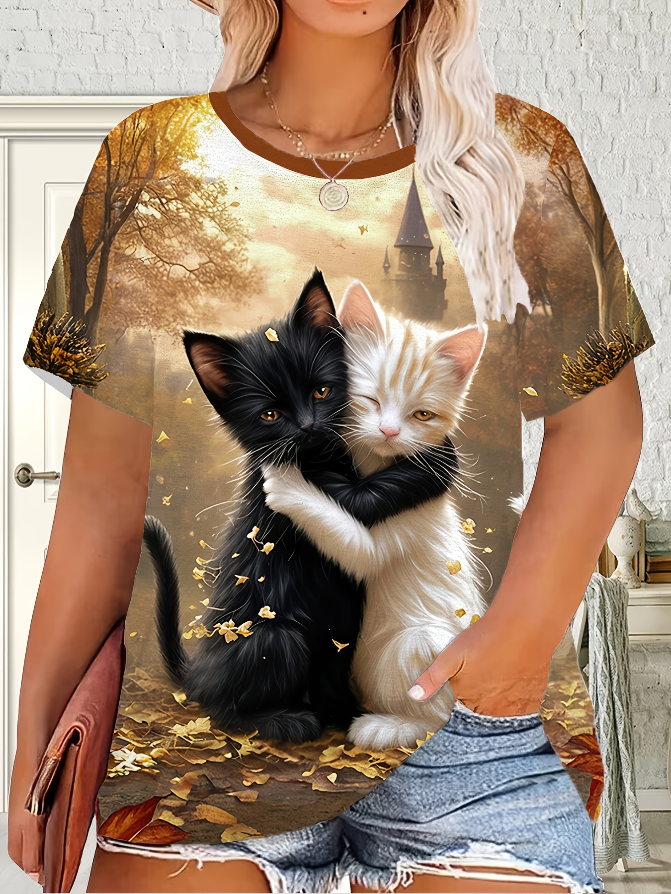 Plus Size, Women's Plus Size Oversized Cat T-Shirt - Fantasy Forest Print with Black & White Kittens, Castle & Golden Leaves - Soft Stretch Round Neck Short Sleeve Summer Top for Casual & Elegant Outfits (Machine Washable) - Cat Lover Apparel