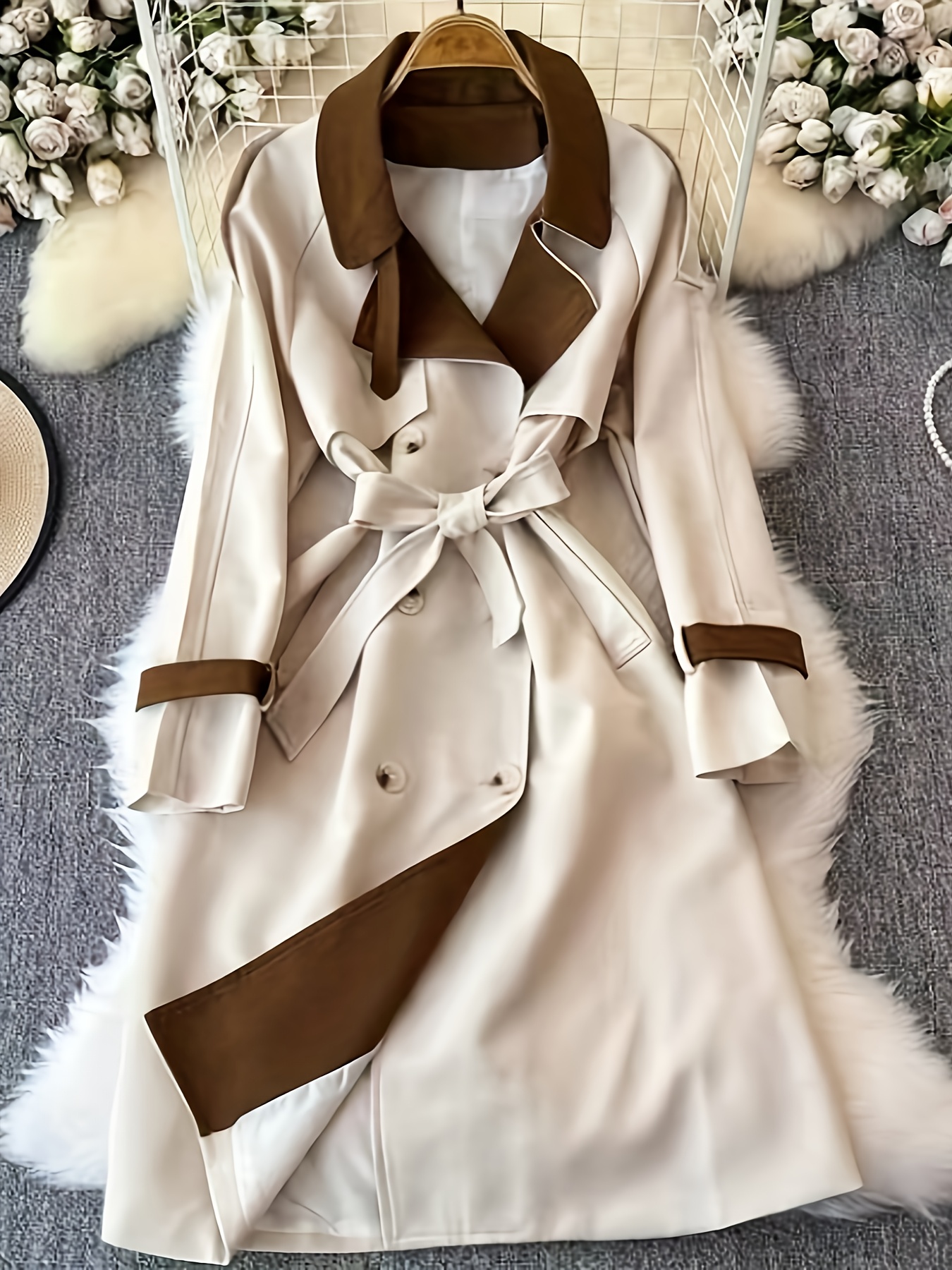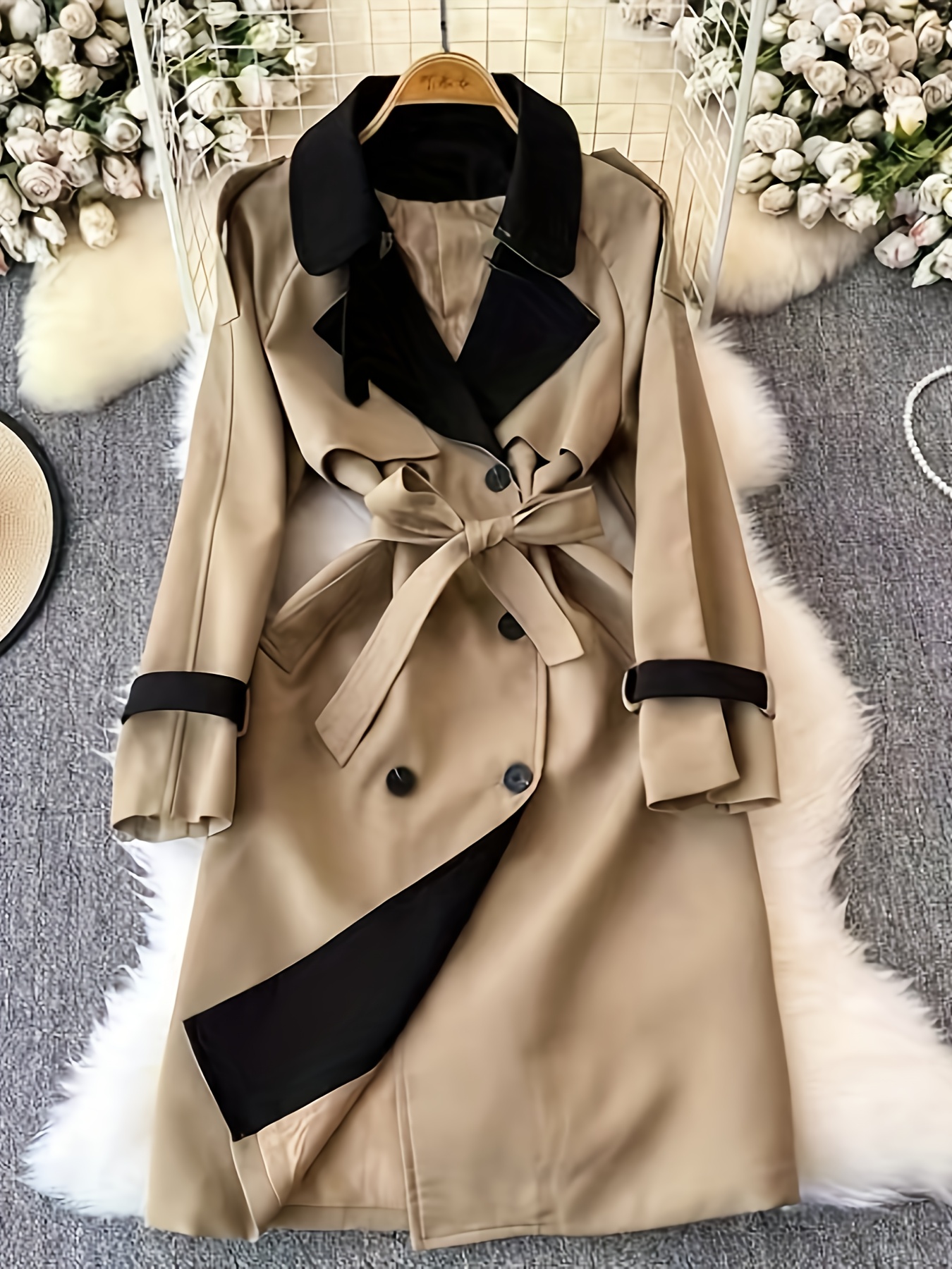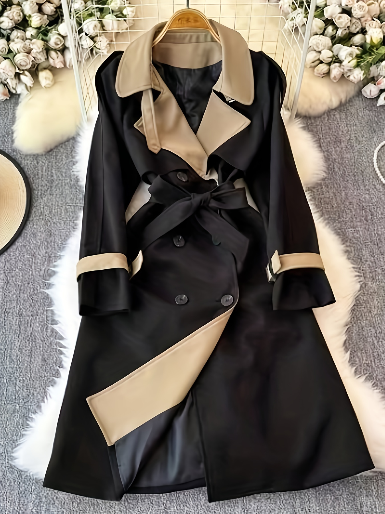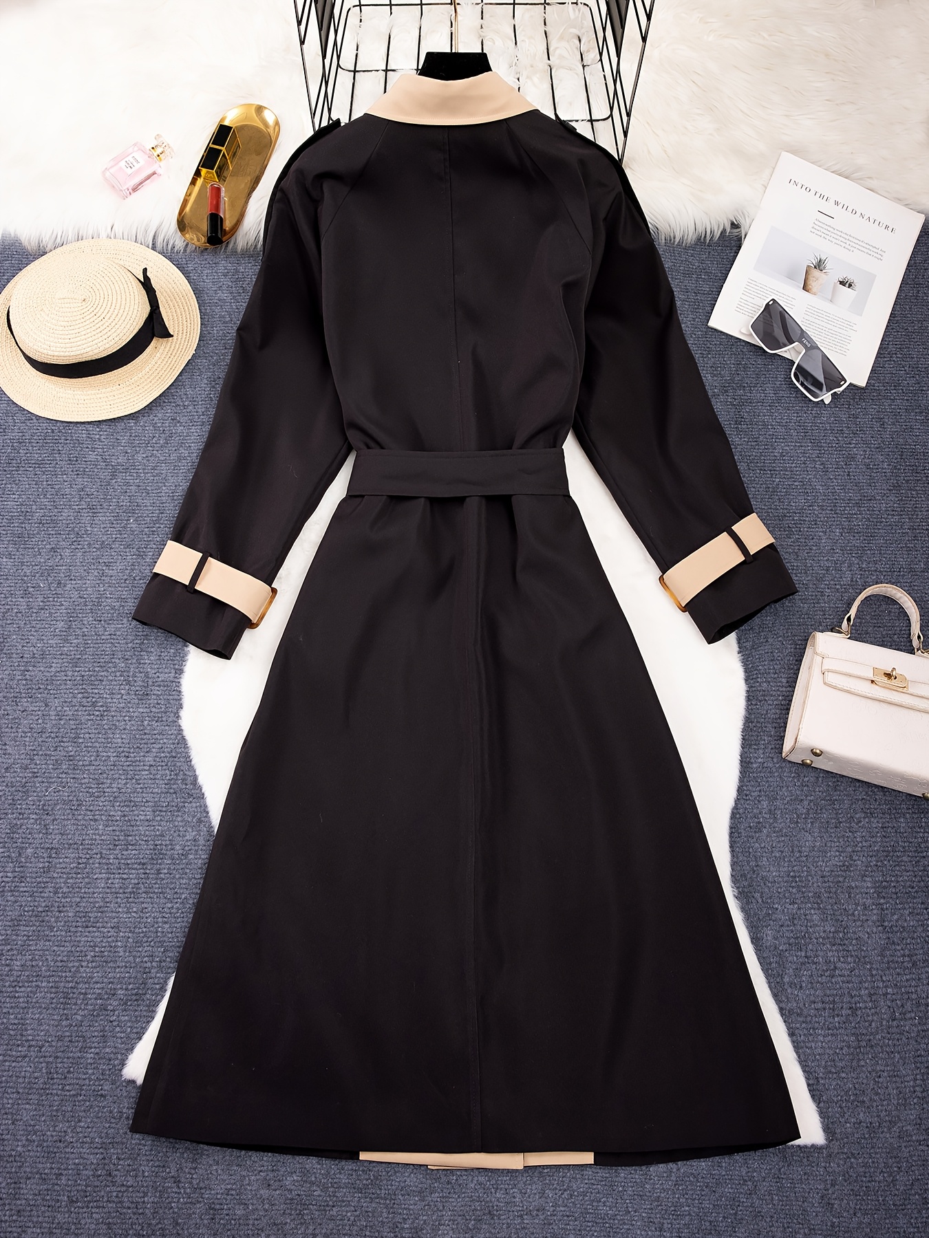 Elegant Beige & Black Color Block Trench Coat with Lapel Collar - Long Sleeve, Mid-Length, Button-Up Outerwear for Women, Perfect for Fall 2025, Stylish Commuter Wear | Chic Lapel Collar | Structured Design