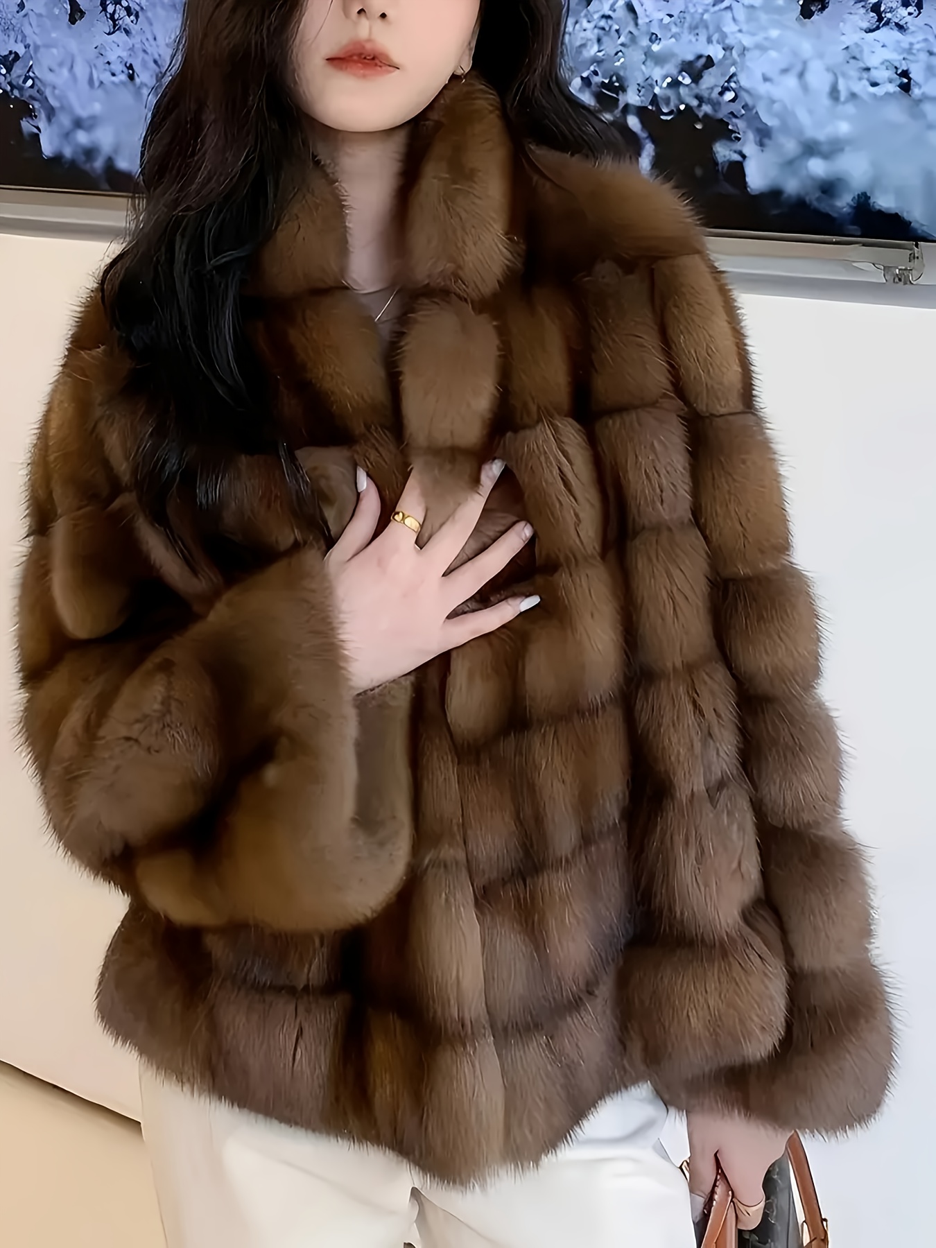 Women'S Elegant Faux Fur Coat - Ultra-Soft Plush Winter Jacket with Contrast Trim, Long Sleeves & Flared Hem, Loose Fit for Casual & Formal Occasions, Fall/Winter Fashion Essential, Winter Outerwear, Sophisticated Style, Luxurious Texture